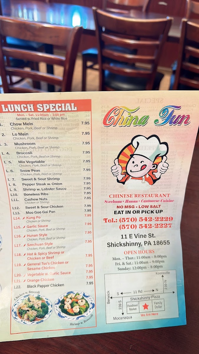 When you walk into China Fun, you're greeted by the delicious aromas of classic Chinese flavors, prepared with care and precision. The menu offers a wide variety of dishes, from savory appetizers to hearty entrées, ensuring that there's something to satisfy every craving. Whether you're in the mood for crispy spring rolls, tender chicken dishes, or a bowl of comforting wonton soup, China Fun Menu has it all. For those who prefer a bit of spice, their Szechuan offerings pack a flavorful punch, while more traditional favorites like General Tso’s chicken offer a comforting and familiar taste. Each dish is crafted with fresh ingredients, and the flavors are bold and balanced. Perfect for both a quick lunch or a relaxed dinner, China Fun is a go-to spot for anyone craving quality Chinese food in Shickshinny.